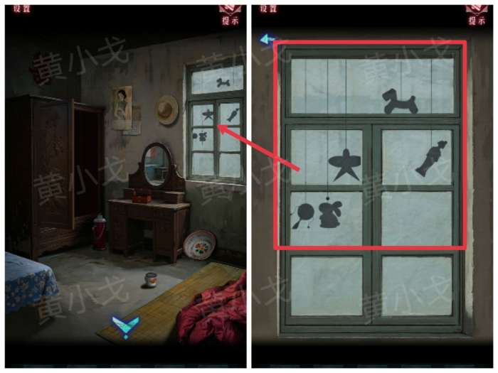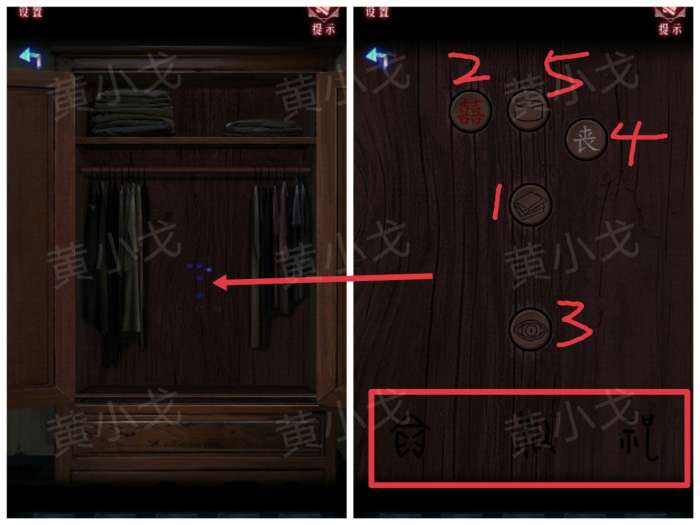 20.点击衣柜上的按钮,根据上面的符号刻痕和按钮上的图案或文字提示,结合播放留声机后得到的线索,按顺序点击按钮,出现暗门