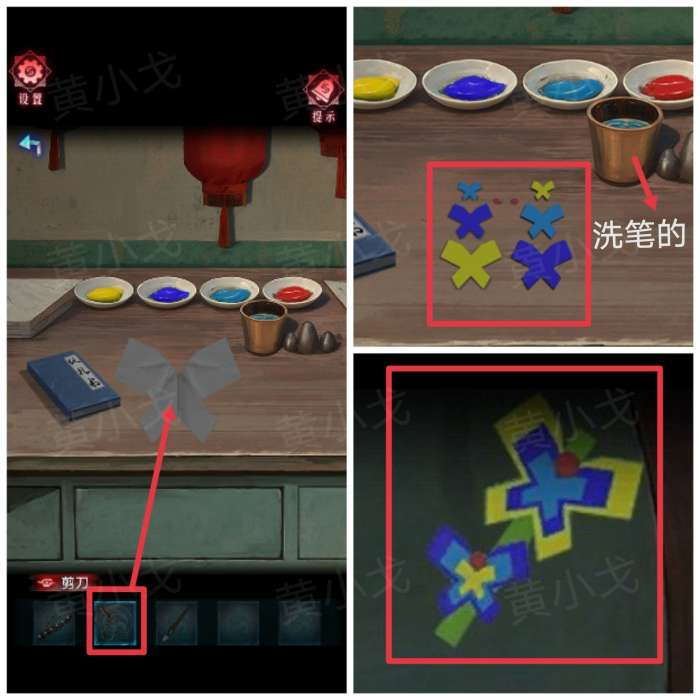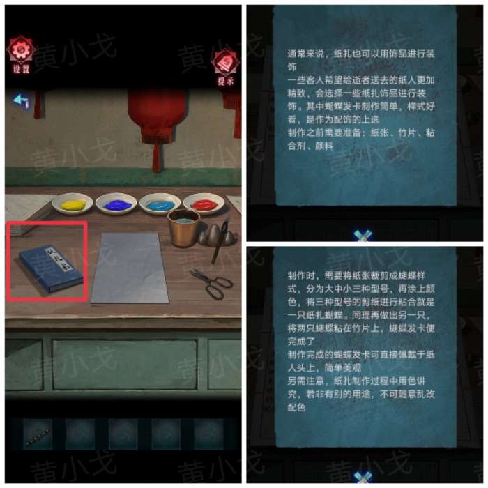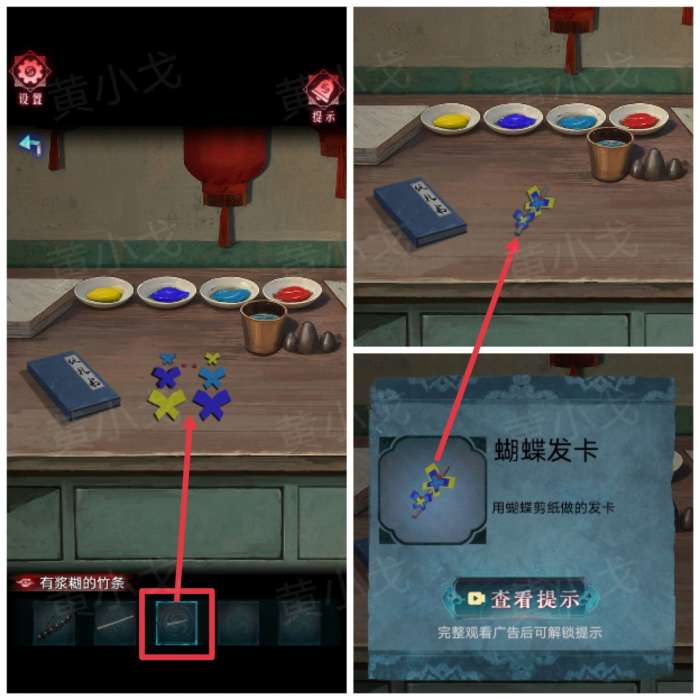 10.用【剪刀】把折纸剪成几只小蝴蝶;根据卧室镜子上的蝴蝶花色,用【毛笔】蘸取对应的颜料,然后给蝴蝶上色