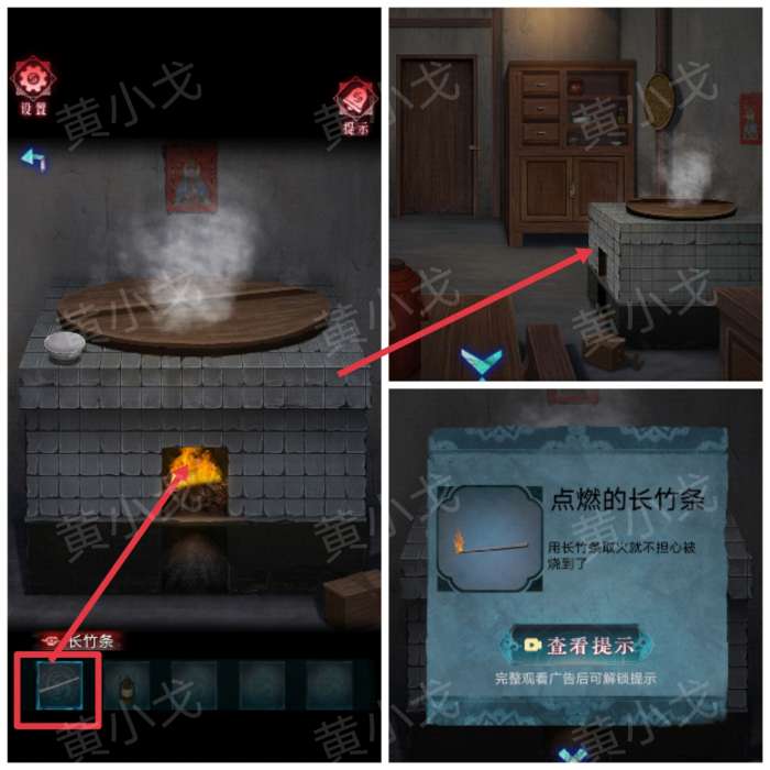 16.点击灶台,用火点燃【长竹条】,获得【点燃的长竹条】