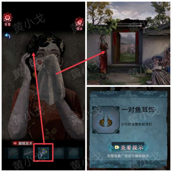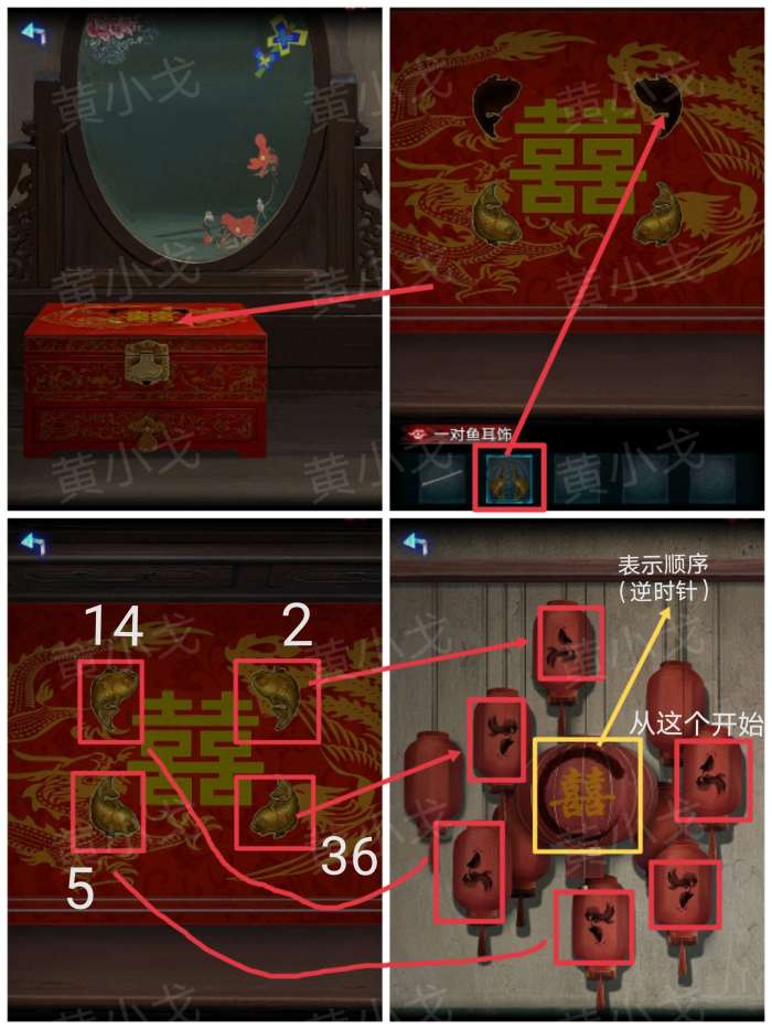 解谜思路:①灯笼上的鱼图案对应首饰盒上的鱼按钮(注意鱼头和鱼尾朝向:例如图案上的鱼头朝上,鱼尾朝左对应首饰盒右上角的鱼按钮)