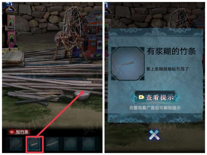 7.先与纸人对话。点击竹条堆,用【剪刀】剪断竹条,获得【短竹条】和【长竹条】