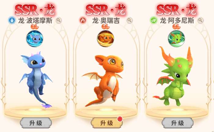 进化:SSR龙宠随着星级的提升,会获得进化效果,形态发生变化,同时解锁专属坐骑。