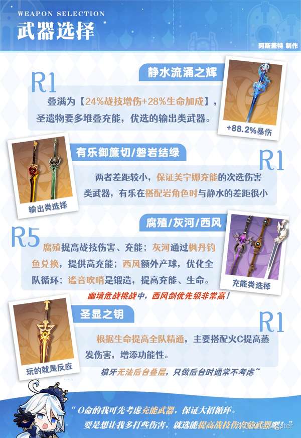 ② 0命芙宁娜优先保障辅助能力,必要时优先考虑充能武器,而非选择上述伤害类武器提高战技伤害。