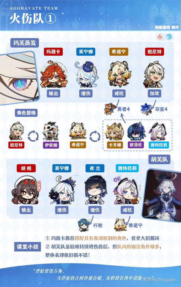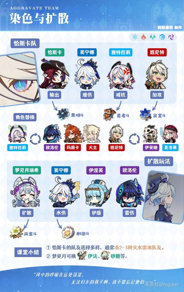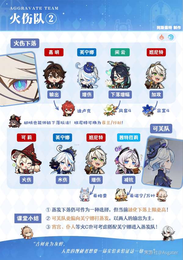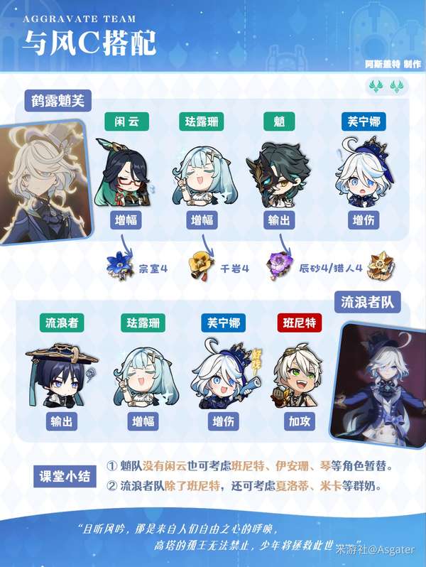 ③ 绫人搭配芙宁娜时,其他角色可选班尼特、万叶/希诺宁等角色,或“爱可菲+茜特菈莉”的四水冰组合(可选攻击杯)。
