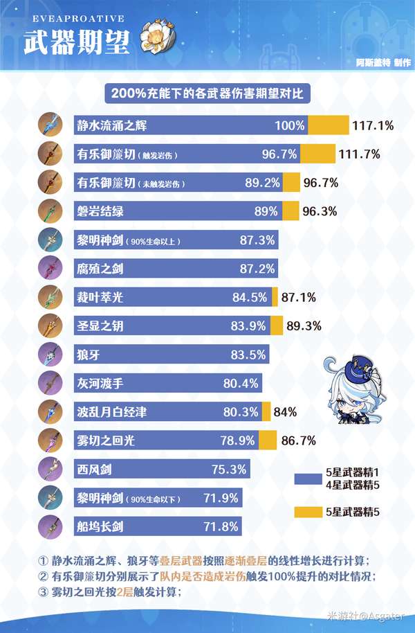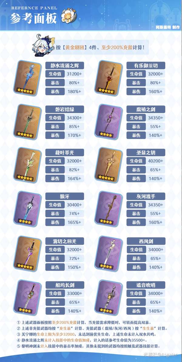 ③ 单水芙宁娜的充能一般在230%+(甚至更高),可优先西风剑等高充能武器。