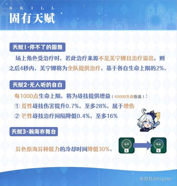 ◆根据芙宁娜的生命上限提高荒性战技的水伤(属于增伤加成)、芒性战技的治疗间隔。
