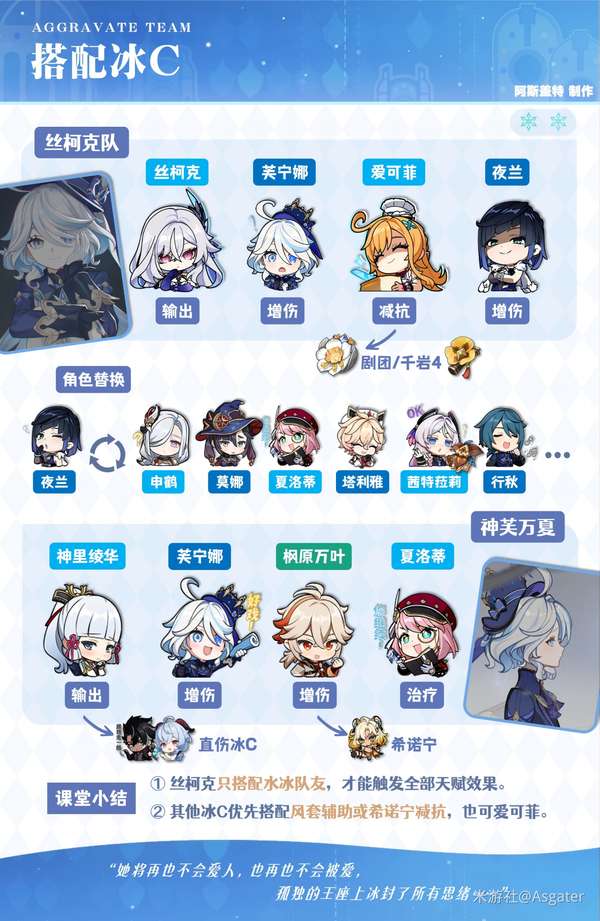 ② 爱可菲在四水冰队能提供高额减抗,战技持续冰伤、大招群奶都非常契合丝柯克水冰队的逻辑需求,通常不替换。