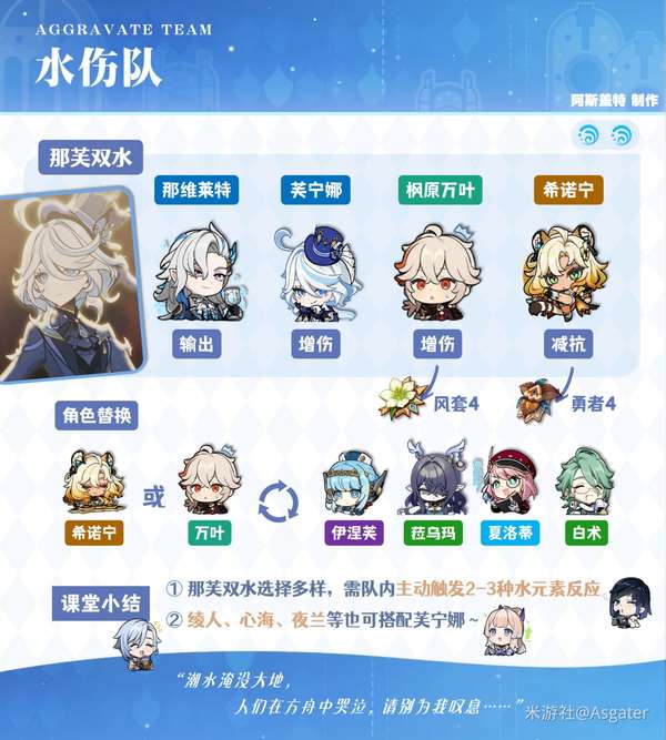 ③ 6命获得水附魔后,也能照常作为一名爆发水C体验水伤直伤,如“芙宁娜+希诺宁+茜特菈莉+万叶”。