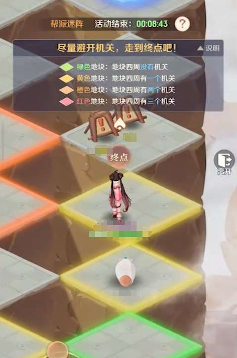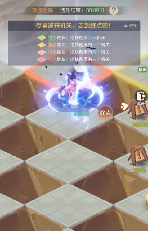 帮派迷阵是限时开放的玩法,它只在每周一、三、五、日的12点和18点开放,其模式与扫雷很相像,需要人们根据地面上各格子的颜色来进行解谜,找出一条安全的线路前往终点。不同颜色的格子所代表的含义完全不一样,其中绿色格子表示周边格子都为安全格,没有任何的机关,黄色则代表周边有一个,橙色则是有两个,红色则说明周边有三个格子存在的机关。要注意,每个格子都只与四个格子接壤,所以玩家在踩到红色格子时,最好原路退回,不要再继续前进,否则必定会触发机关。