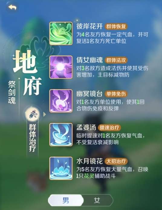 此外,地府和盘丝对队伍提供的增益方向也不一样。地府能让队友免疫物伤并能将伤害反弹,且它的孟婆汤技能会令队友免疫复活后的虚弱效果,更能为队伍召唤花灵来进行助战。而盘丝则是会给多名队友提供法防和法术减伤,减少他们所受到的法术伤害,并能通过灵狐归元技能,清除掉目标队友身上的所有减益效果,并让他摆脱控制效果的影响(冻结、沉默等),还能通过妖尊降世令队友立刻行动,能让速度较慢的队友更早的打出输出。由此可以发现,地府门派更倾向于保全队,而盘丝偏向于增益全队。
