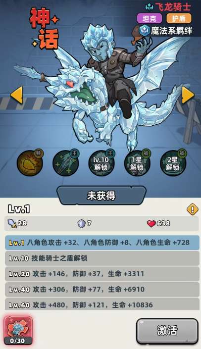 最后为大家推荐的就是飞龙骑士,飞龙骑士前期很多玩家都是会把他放在阵容当中第一排用的,因为他自身的成长数值是三个角色里面最高的,而且对于队友需要保护的时机来说,他能够用到的技能也更多一些,通过他的被动能力,可以让自身受到的伤害数值减少30%,在被动能力上面,他去参与PVE的话,也可以减掉20%的敌人输出效果,在这里所有的输出都降低了30%以后,他在格挡概率上面还可以给自身带来10%的提升,所以放在这里用的话,飞龙骑士不仅可以带来大部分的承伤格挡,还可以通过后期的战技对敌人进行斩击,这里斩击的话是会对敌人造成的攻击力上面百分百的魔法伤害,后续获取的护盾能力也可以维持他在前排的功能性,这里他的生命数值当中,10%的护盾也可以维护他在后续10秒当中受到的伤害,当然,这里如果被敌人持续攻击的话,也会冲撞敌人,附加一定的魔法易伤,这类角色可以后续为他带来更高的前排防护能力,比如击晕敌人的效果就是他在后期3星可以解锁的能力。