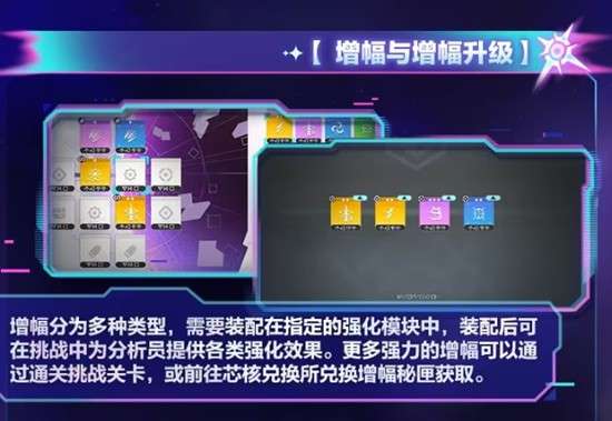 开始挑战前,玩家可以前往【增幅调配】界面选择并装载一个适合分析员的强化核心协助作战。不同类型的强化核心拥有不同的强化模块,可以调配多种增幅。