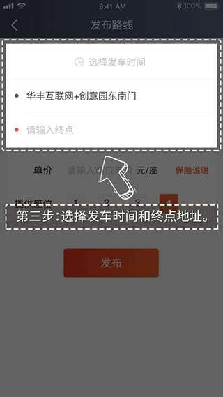 3、选择发车时间和终点地址。