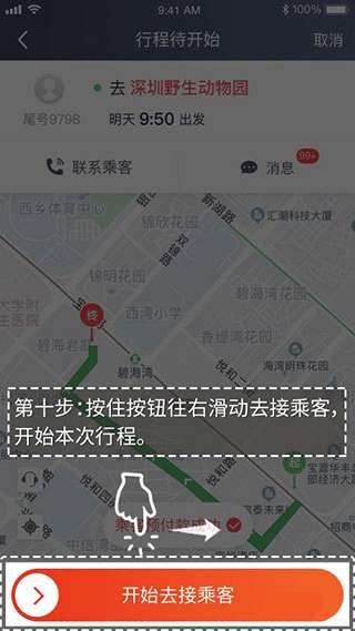10、按住按钮往右滑动去接乘客,开始本次行程。