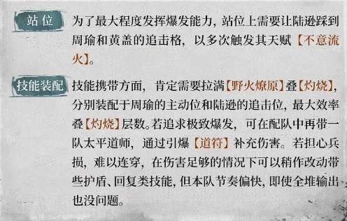 技能携带方面,肯定需要拉满【野火燎原】叠【灼烧】,分别装配于周瑜的主动位和陆逊的追击位,最大效率叠【灼烧】层数。若追求极致爆发,可在配队中再带一队太平道师,通过引爆【道符】补充伤害。若担心兵损,难以连穿,在伤害足够的情况下可以稍作改动带些护盾、回复类技能,但本队节奏偏快,即使全堆输出也没问题。