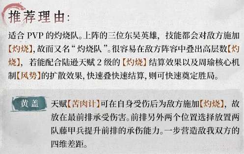 适合PVP的灼烧队。上阵的三位东吴英雄,技能都会对敌方施加【灼烧】,故而又名“灼烧队”。很容易在敌方阵容中叠出高层数【灼烧】,若能配合陆逊天赋2级的【灼烧】结算效果以及周瑜核心机制[风势】的扩散效果,快速叠快速结算,则可快速莫定胜局。