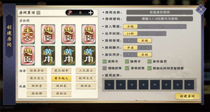 创建房间:我们可以在创建房间页面,设置房间名称、密码、进入等级、禁用武将等设定;左侧可以设定身份牌,可以选择推荐规则,也可自行创建相关规则。