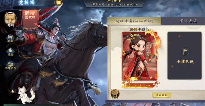 点击竞技,可参与2V2楚汉争霸和身份场蜀汉忠义,这两个是主要玩法,以排位的形式进行。在这个模式下赢得游戏会增加战功,逃跑、失败会减少战功,每个赛季会根据战功发放相应的奖励。