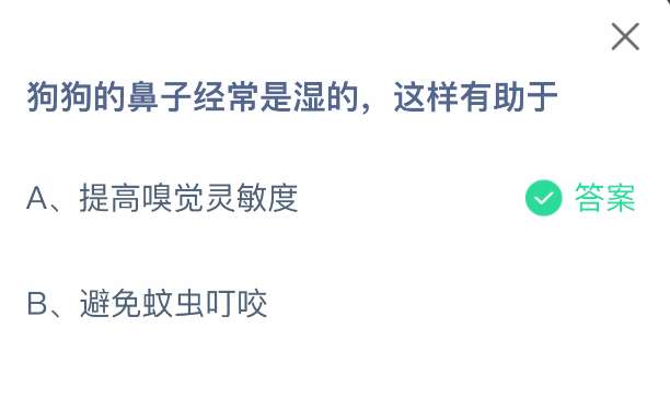 狗狗的鼻子经常是湿的,这样有助于?这是支付宝蚂蚁庄园小鸡答题6月27日题目,支付宝小鸡答题是大家非常喜欢的活动,大家获取饲料就可以喂养小鸡领取更多的蛋去帮助更多的人了!今日正确答案是【提高嗅觉灵敏度】,狗狗的嗅觉非常灵敏,湿润的鼻子能让气味分子更容易附着在上面,从而增强嗅觉的敏锐度。