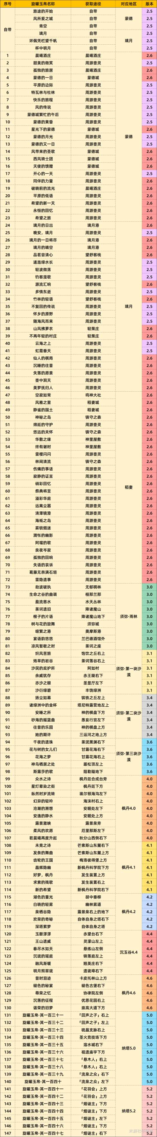 最后再附一张5.2全153张「旋曜玉帛」一览表,5.0+5.2的131~146号唱片暂无名字。