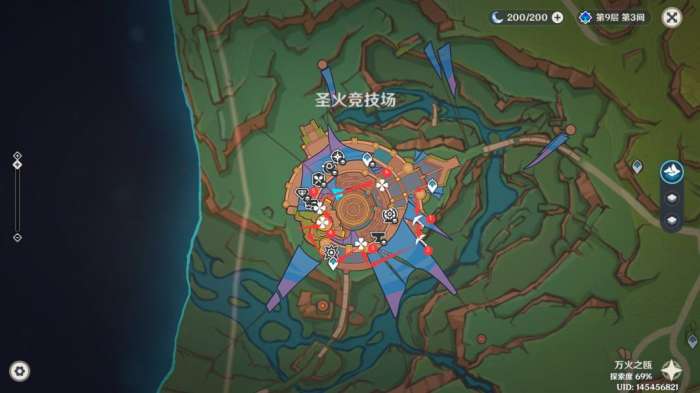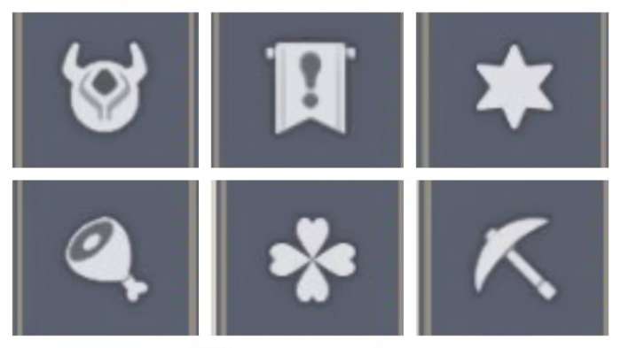 图中地图上以下标记从左往右、从上往下分别作为幻写灵、地灵龛/解谜点(用于开启对应点位的宝箱)、火神瞳、限时挑战、宝箱(包含露天、解谜、挖掘、奇馈宝箱等)、摩拉箱。