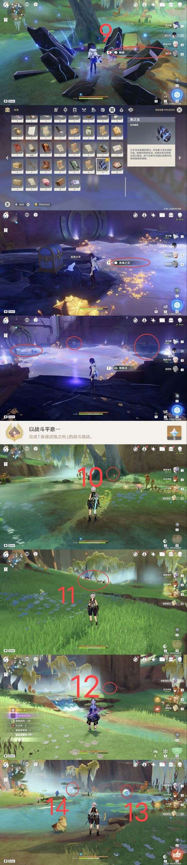 9.两华丽一珍贵两精致,需要完成任务「在应许与遗忘之间」(最后宝箱)、「将夜晚放还于夜晚」(完成即可)、踞石山右边洞窟开启最后的解谜宝箱获得三个「残夜的碎玉」合成「夜之玉」,触碰两次进入夜魂试炼之所,与夜魂之灵对话,开启挑战,在60秒内击败8个魔物,完成即可获得开启宝箱的资格和成就「以战斗平息…」;