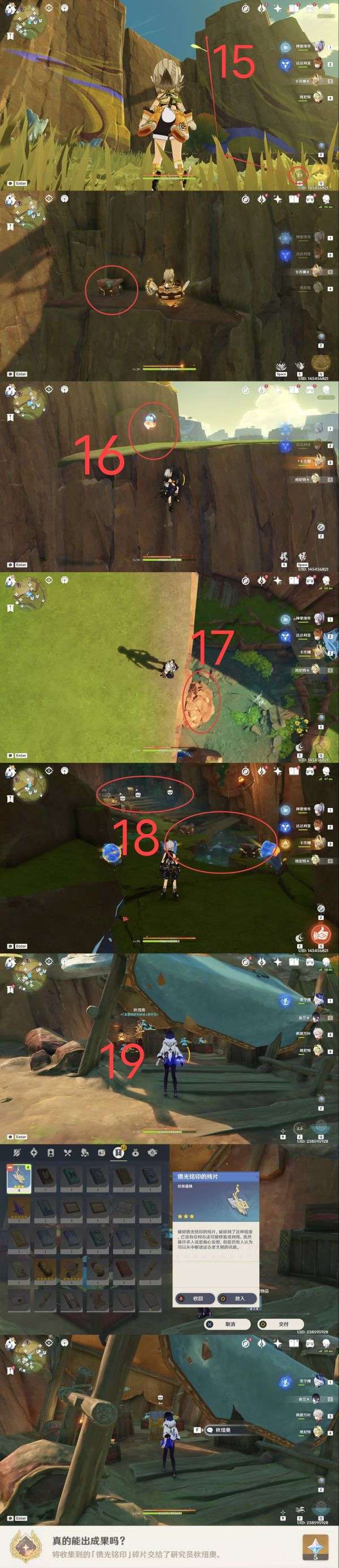 19.华丽宝箱,分别完成任务「群山的影子」(最后宝箱)、「火中取梦的故事」(完成即可)、「在应许与遗忘之间」(最后宝箱)以及地图右下角的岛屿挑战开启最后的宝箱获得四个镌光铭印的碎片,交付给npc秋纽奥获得华丽宝箱和成就「真的能出成果吗?」。