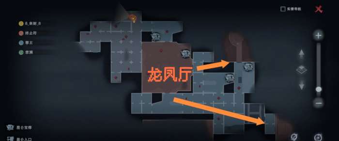 在进入冰区后可以优先寻找龙凤厅,因为大部分情况下都是由龙凤厅延伸过去的,如果在其中遇见了其他的厅也可以直接进去搜,都是OK的。如图,可以看到中间就是龙凤厅(不知道长什么样看上一个笔记),接着以龙凤厅为中心去周围开始搜区块(类似的例子如图)