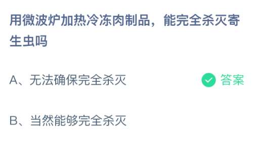 用微波炉加热冷冻肉制品,能完全杀灭寄生虫吗?支付宝小鸡课堂开课啦!每天花一分钟答题赚饲料,喂喂小鸡就能贡献爱心啦!轻松又意义十足!2026年1月13日蚂蚁庄园的小鸡课堂题目正确答案是【无法确保完全杀灭】,用微波炉加热冷冻肉制品,无法确保完全杀灭寄生虫。