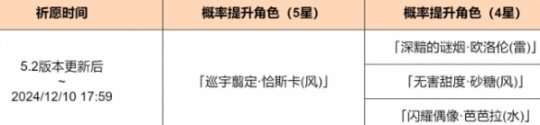 1、上半卡池时间:11月20日5.2版本更新后-2024年12月10日17:59。