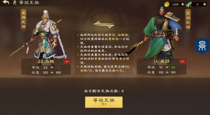 在开荒期可以放心的提升武将等级,在需要置换武将时,可选择等级互换功能。我们可以选择两名武将互换等级、经验值,武将首次互换免费,后续100金一次。