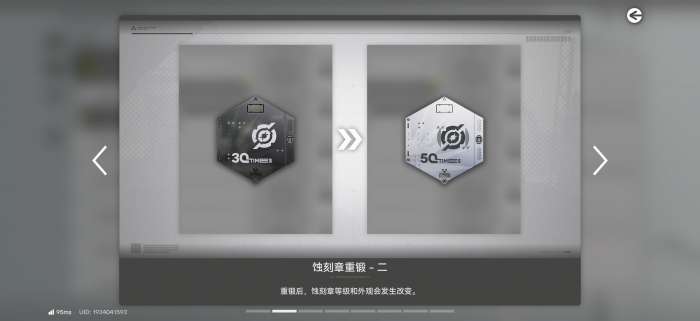 蚀刻章支持深度个性化管理:玩家可对已拥有蚀刻章执行“重锻”操作,改变其基础纹样结构;亦可选择“镀色”,在预设的七种主题色系中切换外观色调。重锻与镀色不消耗源石技艺材料,仅需消耗通用资源“蚀刻粉尘”,且无次数限制。调整后的蚀刻章将实时同步至“光荣之路”首页展示区,支持自由拖拽排序,构建专属荣誉陈列空间。
