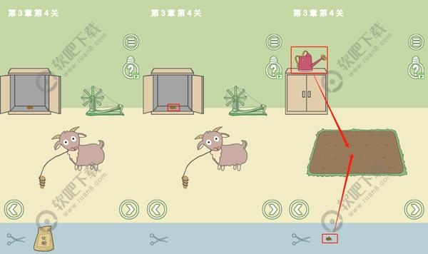 4、将草给场景二中的小羊,然后使用剪刀从羊身上获得羊毛,再使用右上的机器获得绳子