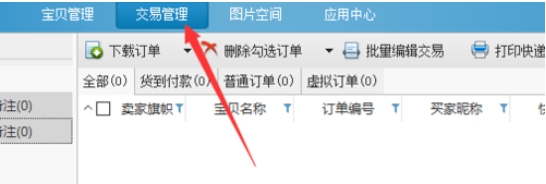 2、 这时打开淘宝助理软件后,选中上方的“交易管理”;
