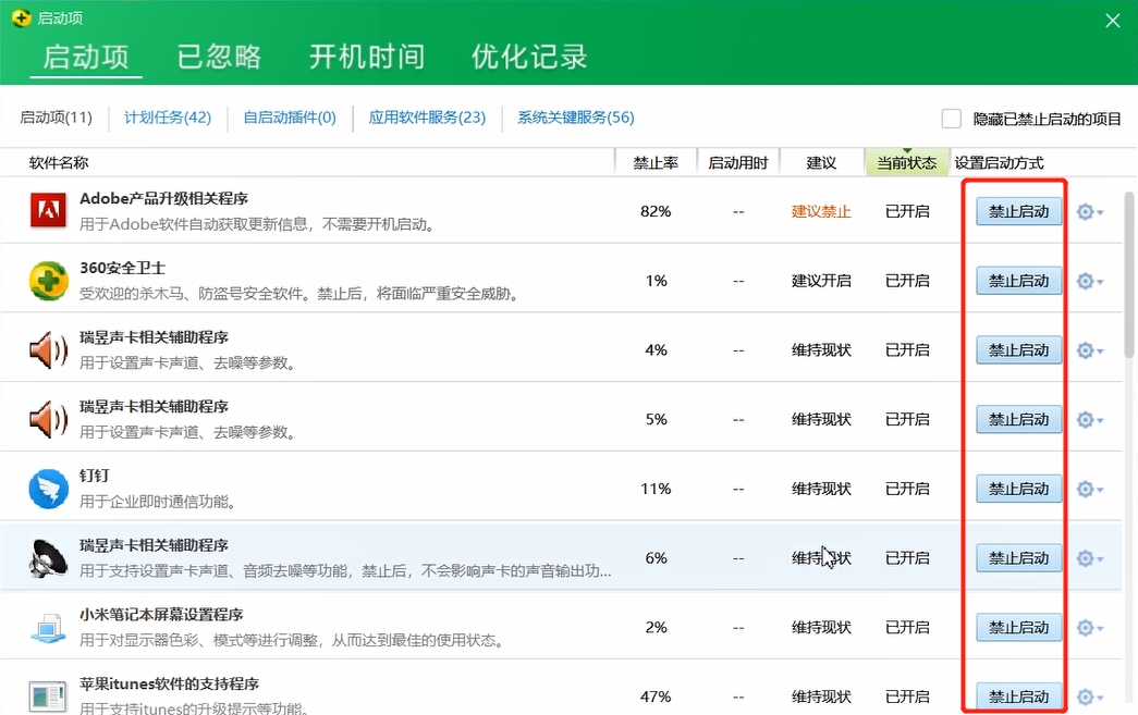 第三步:这时可以看到开机自动启动的软件,想要禁止的话点击右侧的禁止启动即可。