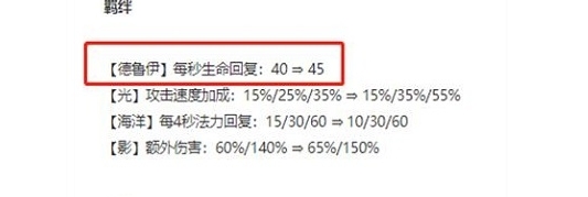 在云顶之弈最新的版本中,德鲁伊得到了增强,每秒的生命回复从40增加到了45。这意味德鲁伊在前中期的回复能力更加强悍。不仅如此,德鲁伊的唯一输出卡——妮蔻,最大法法力值得到了大量缩减!三森林三德鲁伊在前期的有了巨幅加强。