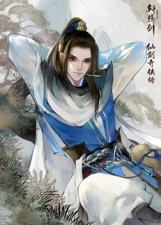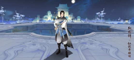 英姿飒爽的李逍遥,执剑闯江湖,手握酒杯泯千愁。上身着一袭蓝衫,三色股绳环绕腰间,外罩白巾迎风而起,黑发高冠显逍遥。
