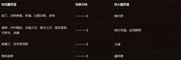 以上服务器中的玩家可以在角色选择画面或者排队画面进行免费角色转移。在高峰阶段,免费角色转移可能需要花费最多数个小时才能完成。如果转入服务器达到了满负载,免费角色转移服务可能会随时关闭。