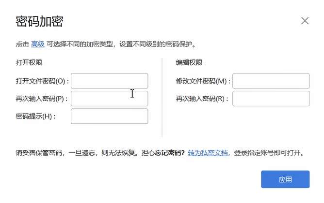 在弹出的窗口中可以设置文档的打开权限和编辑权限,用户们可以根据自己的需求进行设置,设置完成点击应用即可。
