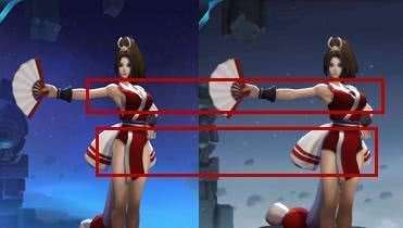 实际上,现在的不知火舞是加了衣服的,下面是不知火舞的对比图,之前的不知火舞和现在的不知火舞可以说是经过了一个调整的,除了大腿,腋下也加了衣服。