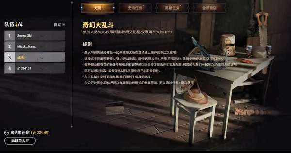 3、准备完毕后点击该界面下方的开始游戏即可进行游戏,奇幻大乱斗将在艾伦格地图上以第3人称四排模式进行,游戏最多可以有80名玩家参加,支持单人小队;