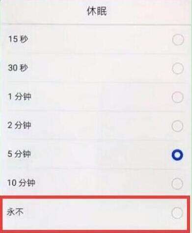 4、在弹出的选项框中点击勾选【永不】即可设置屏幕常亮,勾选其他时间即可在规定时间熄屏。