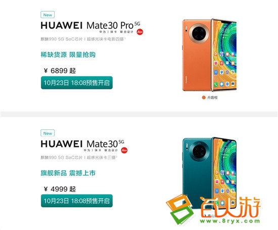 华为天猫官方旗舰店预告,Mate 30系列5G新品将于10月23日18:08开启预售。售价方面,Mate 30 5G起售价为4999元,Mate 30 Pro 5G起售价为6899元。
