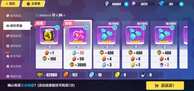 2、联机商店,消耗红玉和蓝玉去换三分结晶,三合一崩坏结晶,多久一个结晶依自己的情况来看。