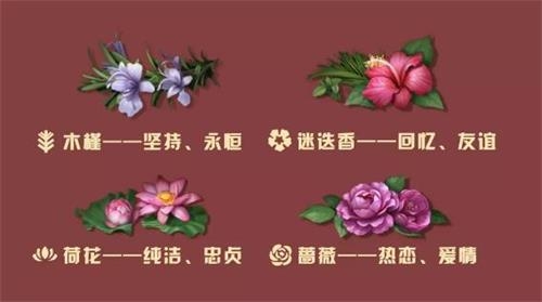 其中,根据鲜花品种的不同,玩家可以收集对应的数量进行配置,进而在指定的活动页面兑换丰厚的奖励,如:花语礼盒需木槿3个,其他三种鲜花各两朵方能兑换,打开后可以获取配方残叶150、技能点8000、新币5000的任意一种等。