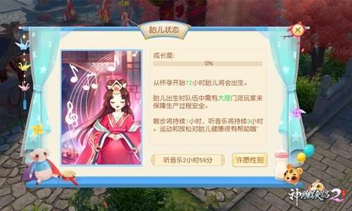 需要注意的是在胎儿降生时,队伍中需要有大理门派的大侠来保障生产安全。所以有此意向的大侠,建议提前联络好大理门派,以免最后关头手忙脚乱。