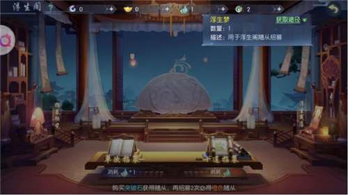 增强玩家战力的最直接有效的方式就是强化自己的随从。在游戏中,玩家可以用珍贵道具浮生梦来招募随从。随从根据强大与否,分为天赐、御诏、封选和广征四种品级,分别对应红金紫蓝四种颜色。招募到这四个品级的概率依次是3%、13%、61%、23%,不难看出,抽到强大的随从的概率还是很大的。
