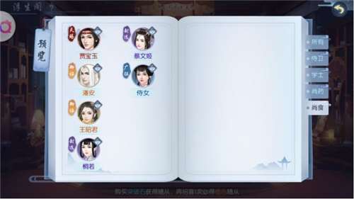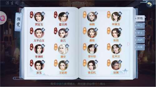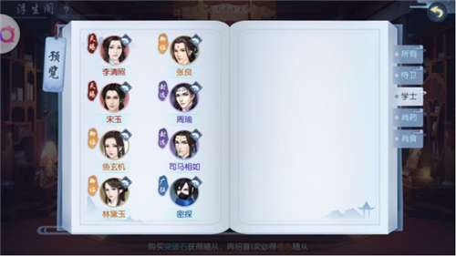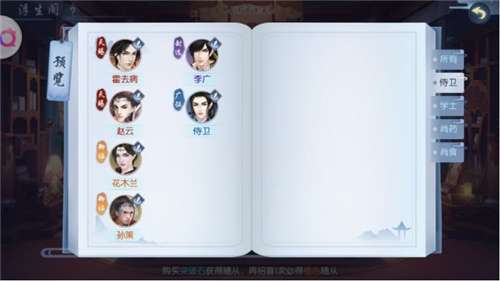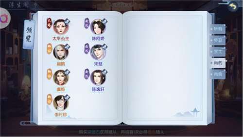 而玩家的战阵随着玩家等级的上升,最多可以有六个位置,包含一个主战和另外五个位置。主角在玩家进入游戏时由玩家自行选择,分为侍卫、学士、尚食、尚药四个职业。战阵中的另外五个位置则需要玩家来配置。如果你主角选择的是偏向单体攻击的侍卫,那么你就要在战阵中放置擅长于群体Aoe攻击的学士,再辅以负责控制的尚药以及保证生存的尚食。而怎么来搭配随从,又搭配谁,这就是精髓所在了。
