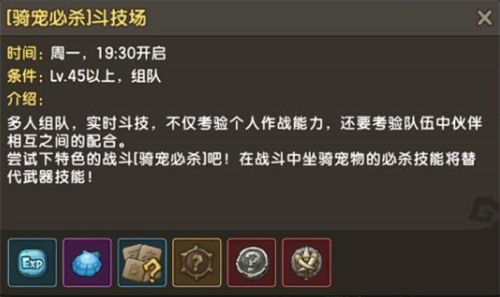 其次,我们可以通过斗技场来获取宝石,周三/周五的经典斗技场,或是周一开启的【骑宠必杀】斗技场都能够获取随机部位的宝石。一方面我们可以考验个人作战与伙伴间相互配合,另一方面,活动奖励也是我们所需要的宝石,既好玩又能变强,何乐而不为?