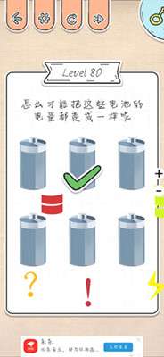 在最强大脑急转弯中,第80关的题目是“怎么才能把这些电池的电量都变成一样呢”,有些题目并不需要知道太多,基本的一些常识了解到就可以了,下面小编就来为大家介绍一下最强大脑急转弯第80关怎么过吧,一起来看看。